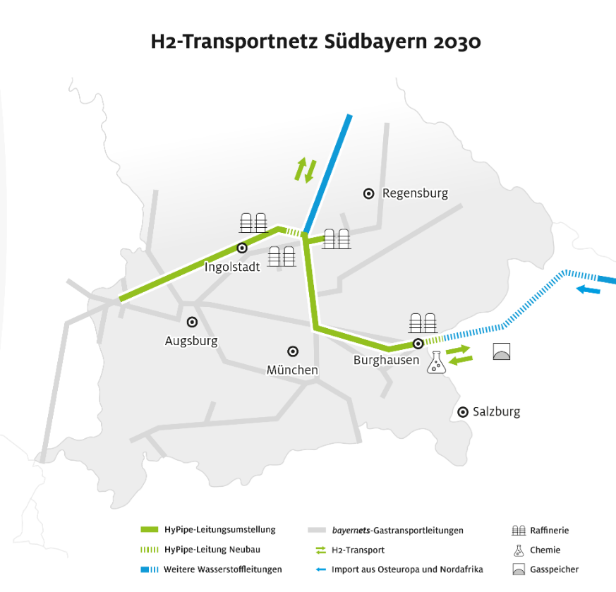 In Bayern verläuft die Leitung über Ingolstadt nach München und von dort nach Burghausen. Ausgehend vom Kernnetz gelangt der Wasserstoff nach und nach über die regionalen Verteilnetze in die Gemeinden.